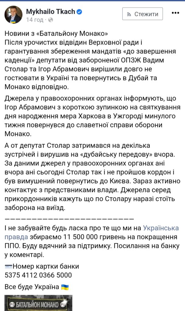 «Зараз активно контактує з представниками влади. Джерела серед прикордонників кажуть, що по Столару наразі стоїть заборона на виїзд», — написав Ткач.