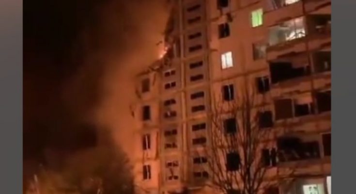 У мережі поширили кадри з місця прильоту. На них видно охоплену вогнем і димом багатоповерхівку.