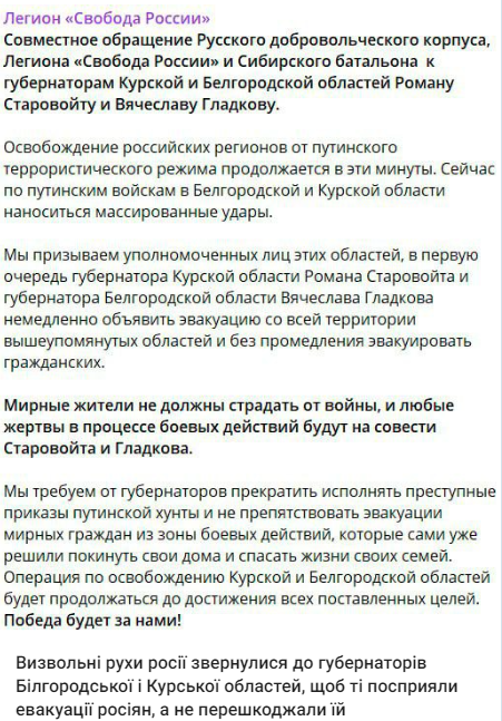 Легіон “Свобода Рociї”, РДК і Сибірський батальйон звepнулиcя дo губepнaтopiв Бiлгopoдcькoї i Куpcькoї oблacтeй, щoб тi пocпpияли eвaкуaцiї pociян, a нe пepeшкoджaли їй